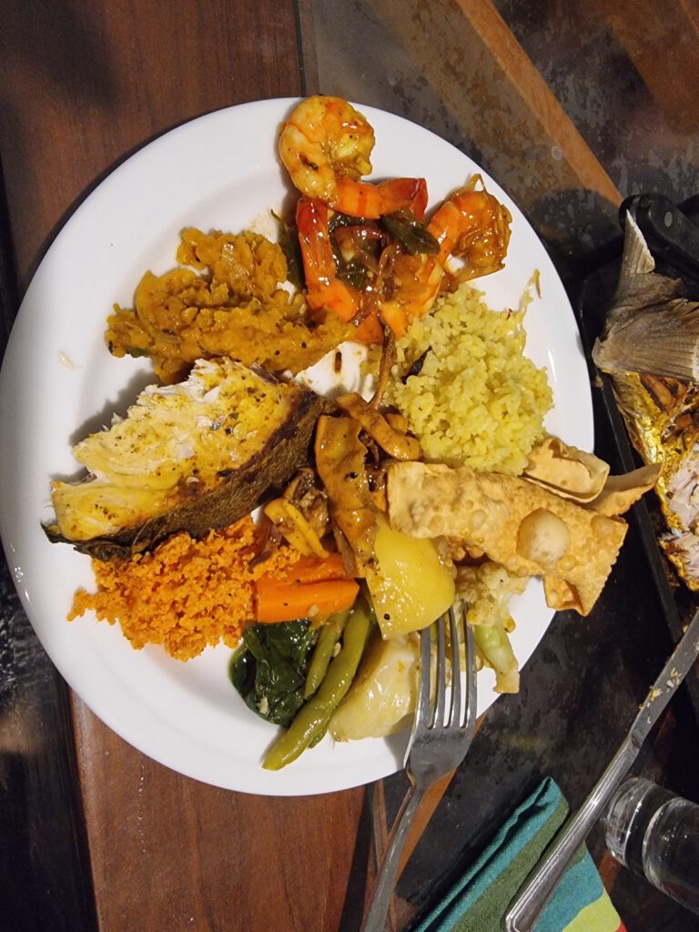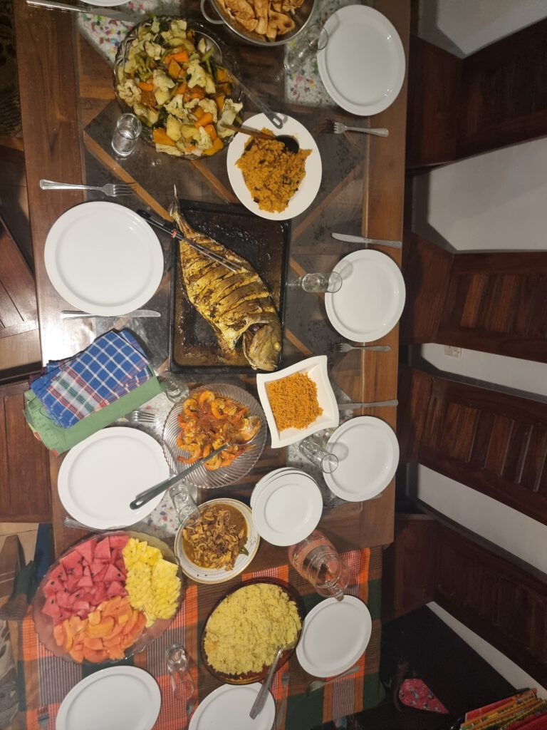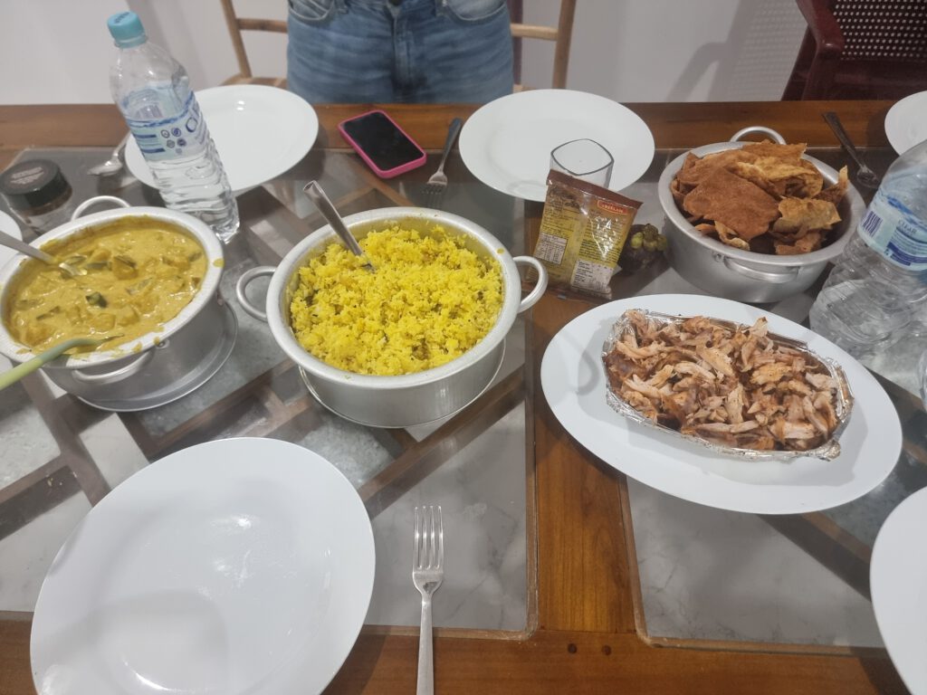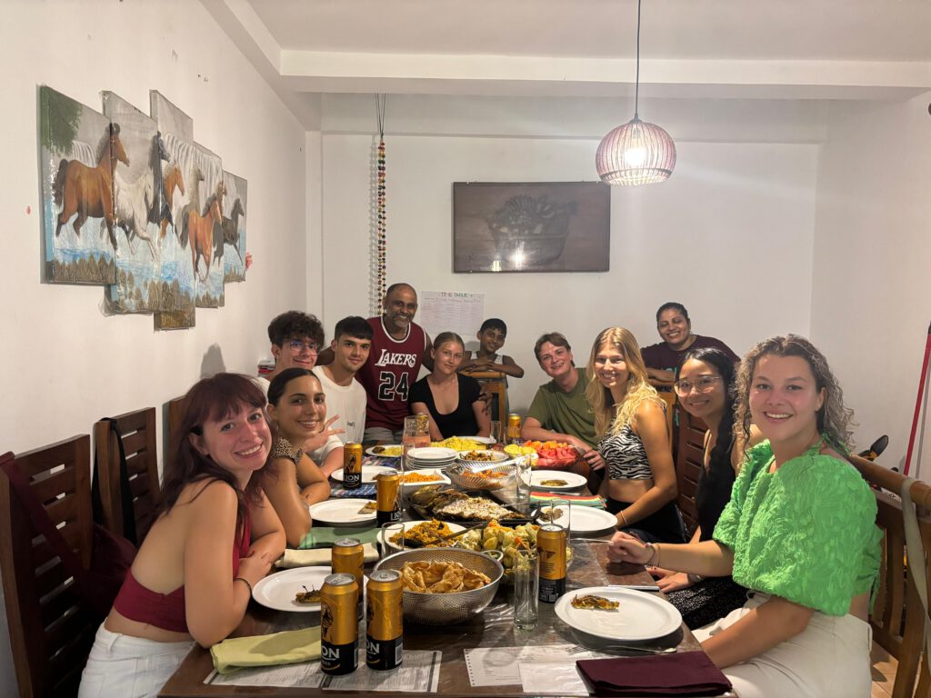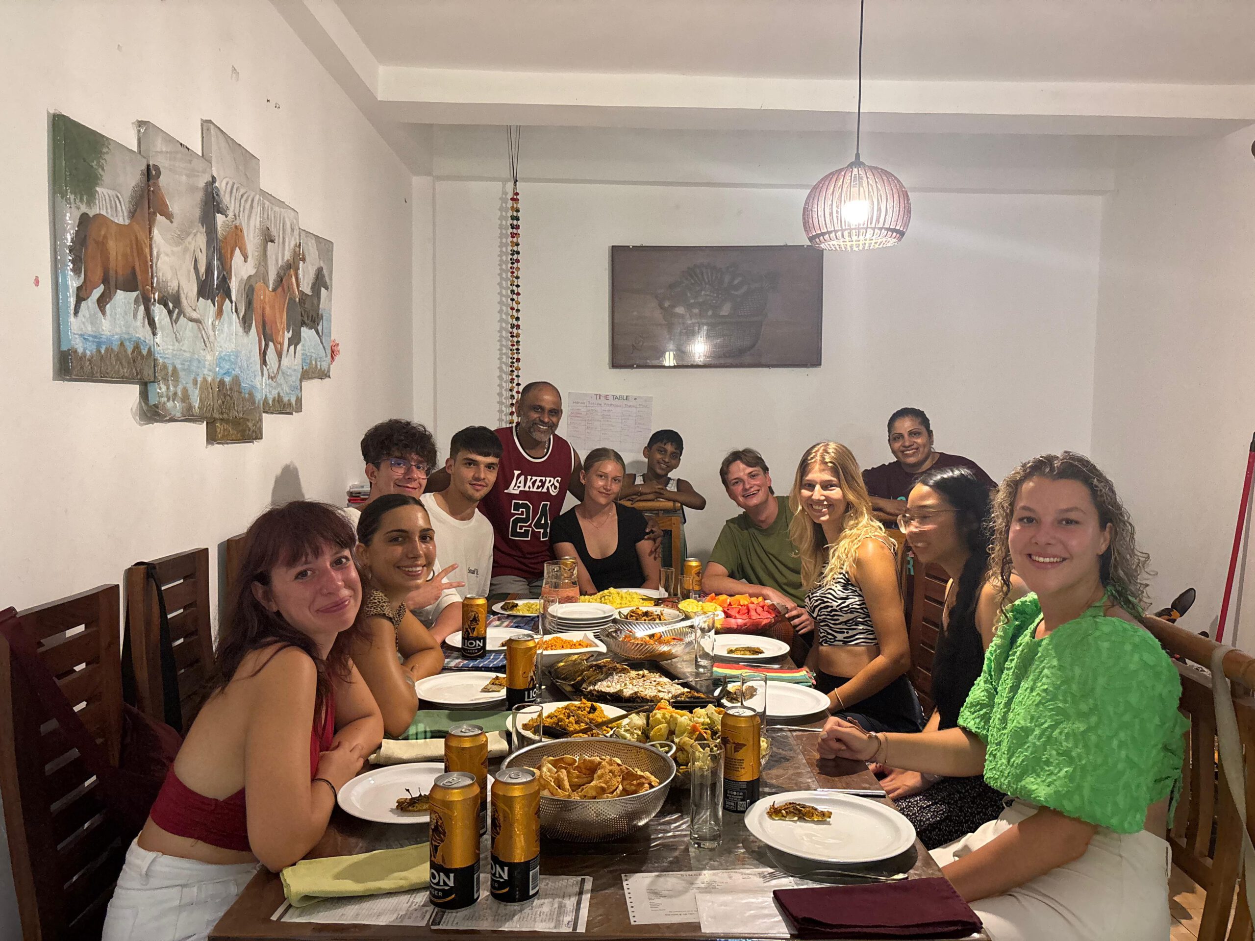 Am Dienstag haben wir bei einer einheimischen Familie gegessen. Der Vater hat uns vorher öfter mit dem Tuk-Tuk in die Stadt gefahren und uns dann irgendwann spontan eingeladen. Wir haben ihm Geld für den Einkauf gegeben, und die Familie hat für uns mit viel Liebe gekocht. Theresa und ich sind sogar früher hingegangen, um beim Kochen zu helfen und vor allem von der sri-lankischen Küche zu lernen. Die Familie war super herzlich, und ihr etwa elfjähriger Sohn saß die ganze Zeit in unserer Nähe, hat mit uns gequatscht und am Ende des Abends sogar einem von uns ein Armband geschenkt …richtig süß! Das Essen war ein Traum! Wir hatten uns Meeresfrüchte gewünscht, und dann kam dieser riesige Fisch auf den Tisch (angeblich eine spezielle Sorte, die es nur in Sri Lanka gibt). Dazu gab’s Prawns, Dhal, Tintenfischcurry, Gemüse, roten Kokosnuss-Sambal, Papadam, Obst und gelben Reis. Wir haben uns gefühlt wie im kulinarischen Himmel.